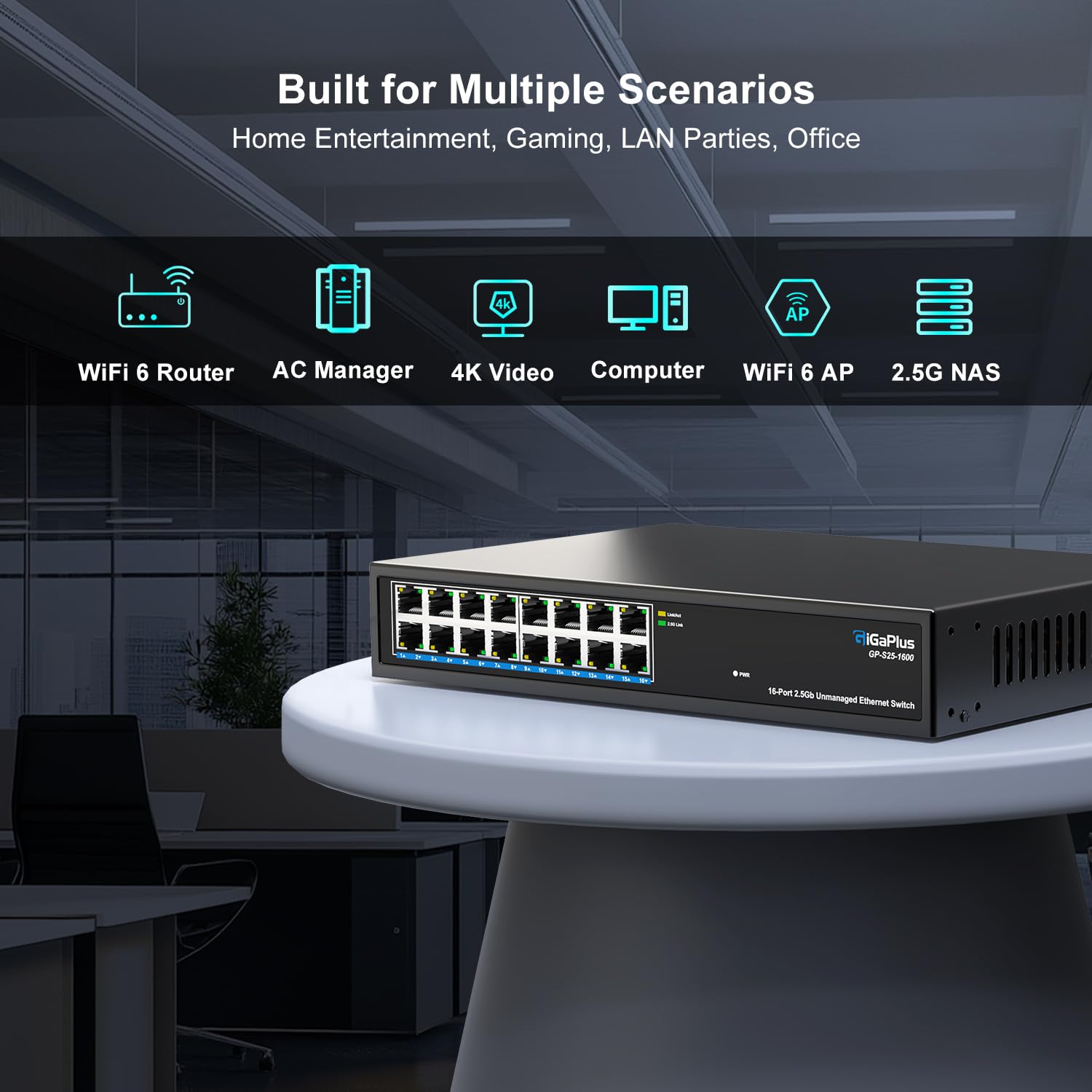 - πPlug and Play: Unmanaged Plug and Play with automatic MDI/MDIX and non-blocking data forwarding support, and 10/100/1000M/2.5G adaptive support on ports 1-16 for speeds up to 2.5 times faster than existing 1G networks. Easily set up without any configuration or software to provide optimal performance for all your devices.