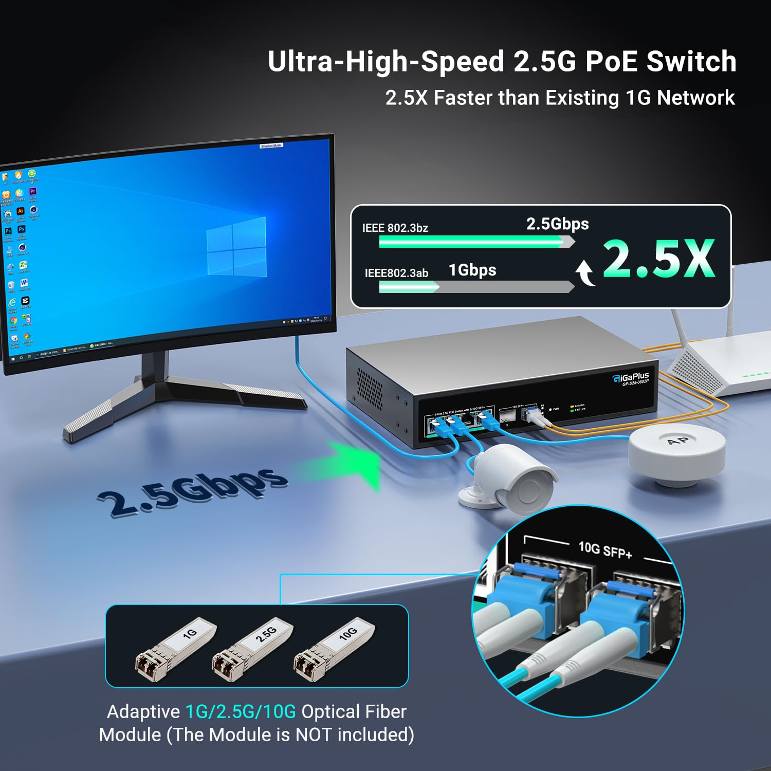- 🔹Wide Range of Applications: The 2.5G PoE switch is highly compatible with 2.5Gbps NAS, 4K PoE cameras, gaming PCs, 2.5G servers, 2.5G WiFi6 APs, and PCIe adapters, meeting the needs of various network environments and suitable for shopping malls, schools, hospitals, hotels, and small and medium-sized enterprises.