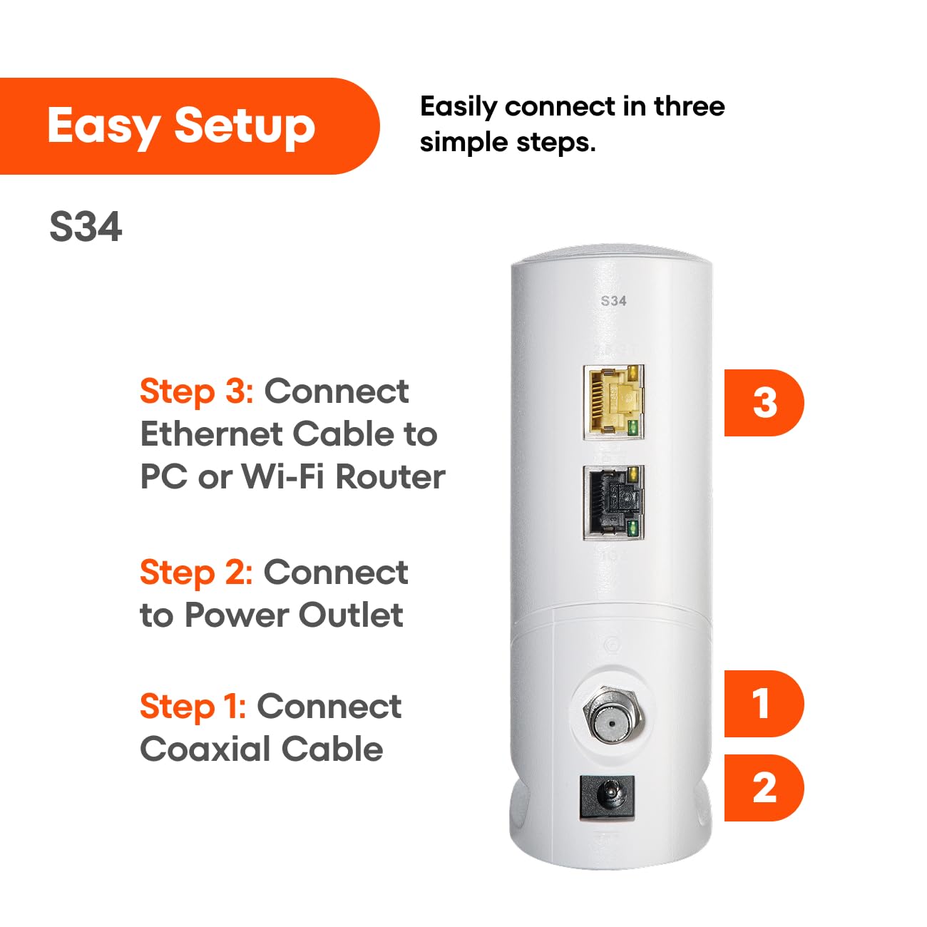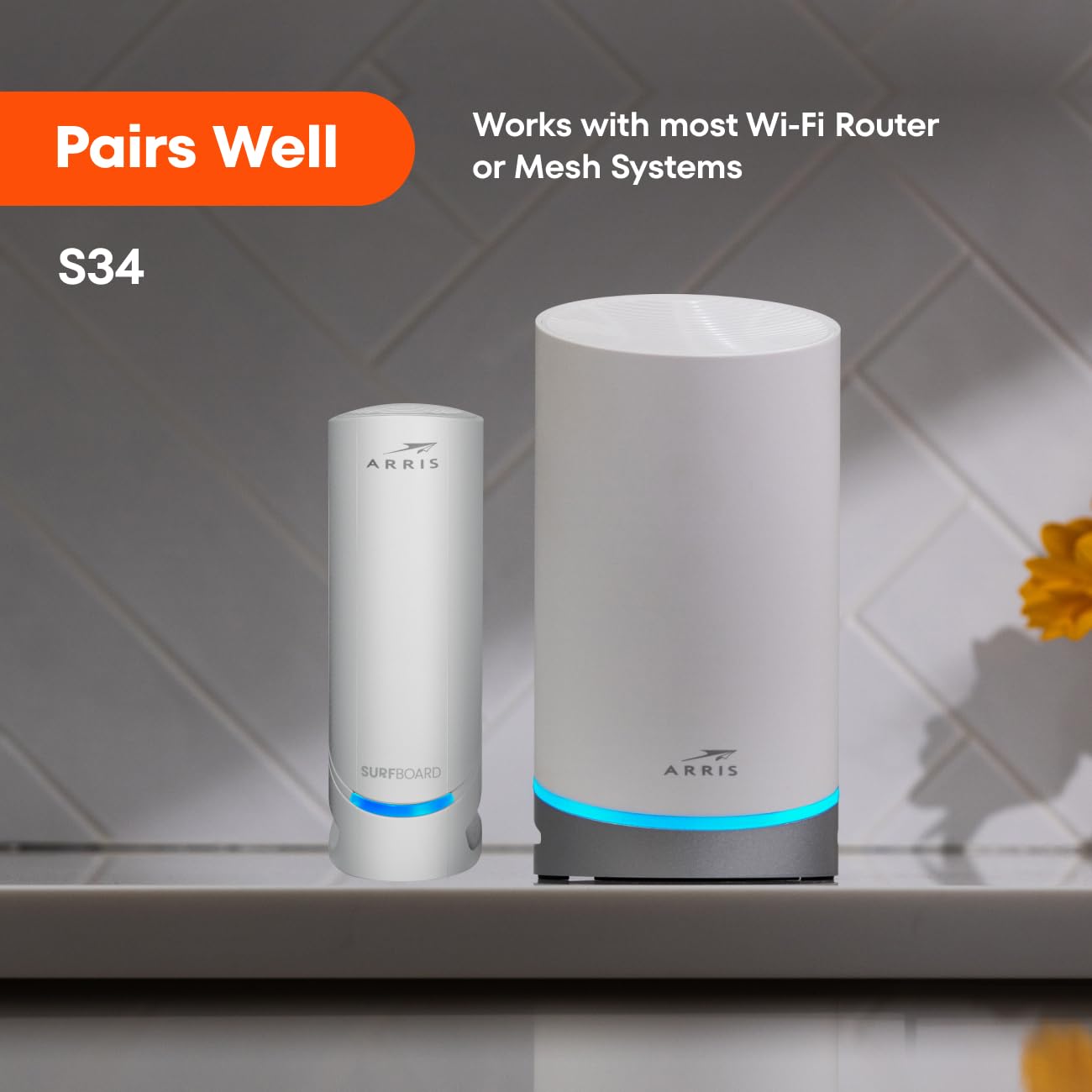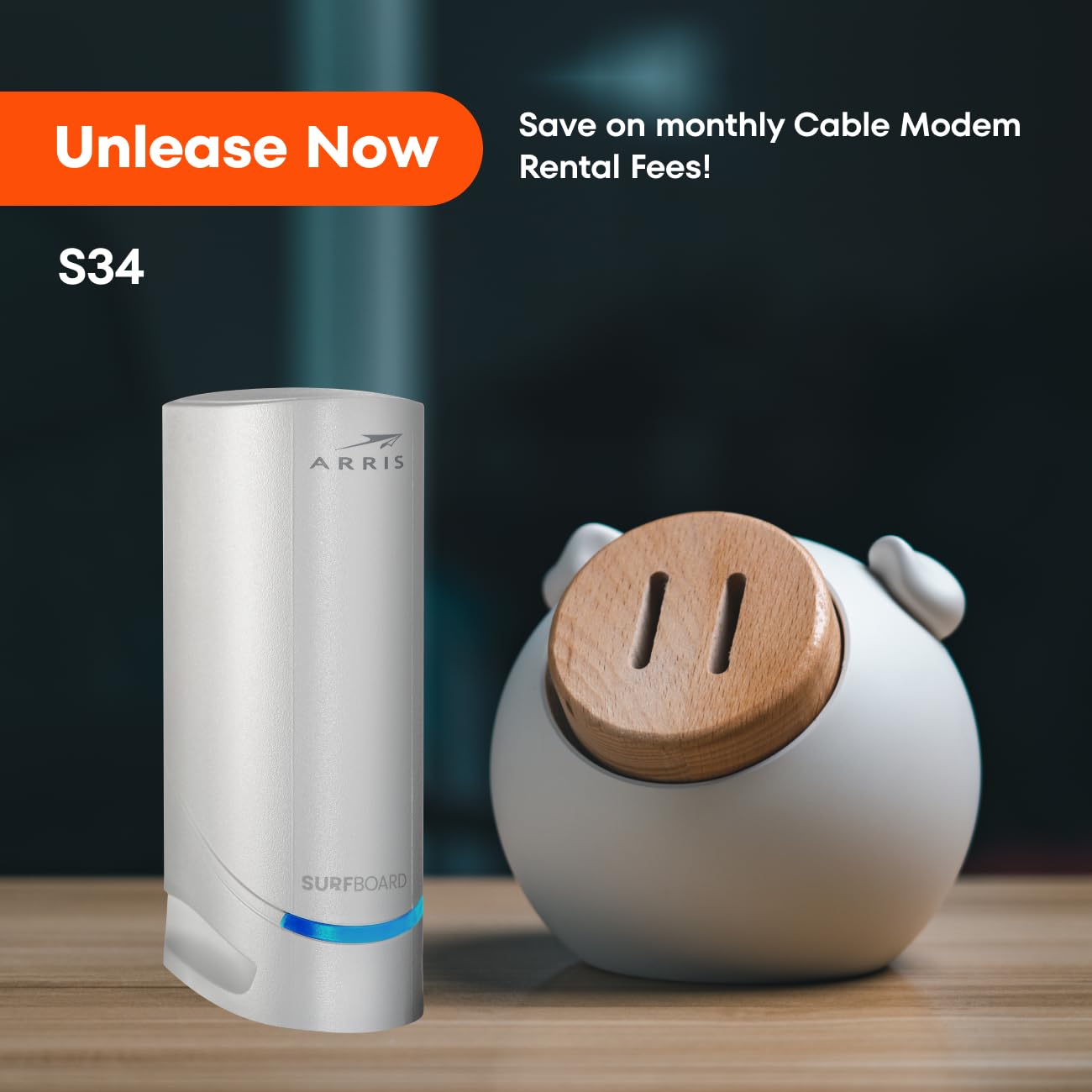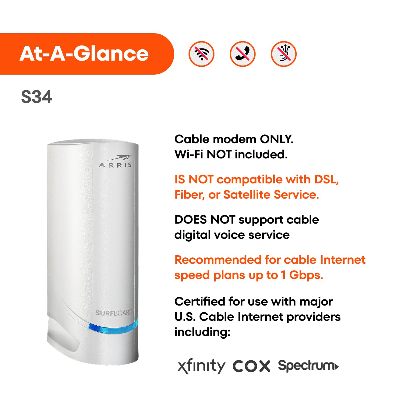 Details: The SURFboard S34 will future-proof your home with the latest DOCSIS 3.1 technology, supporting multi-gigablit internet plants. The SURFboard S34 features support for the the new, next generation upload speed tiers offered by cable internet providers. YWith a 2.5 Gbps Ethernet port plus an additional 1 Gbps Ethernet port it's capable of combined download speeds up to 3.5 Gbps. The S34 is the newest modem in the SURFboard lineup, delivering the fastest speeds and the latest technology without the premium rental cost.