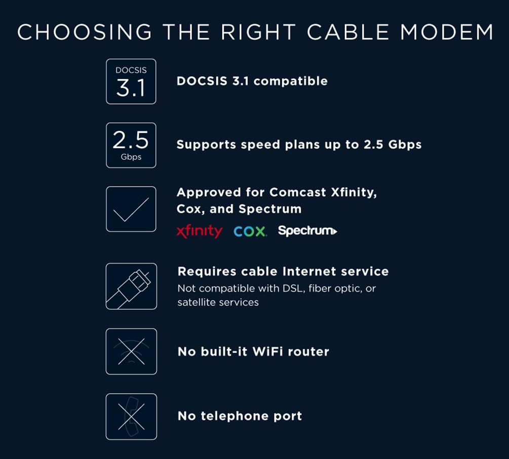 - Approved for Comcast Xfinity, Cox, Spectrum, RCN and Astound and supports the fastest internet plans available. The products are residential only. Please verify your ISP requirements prior to purchase.