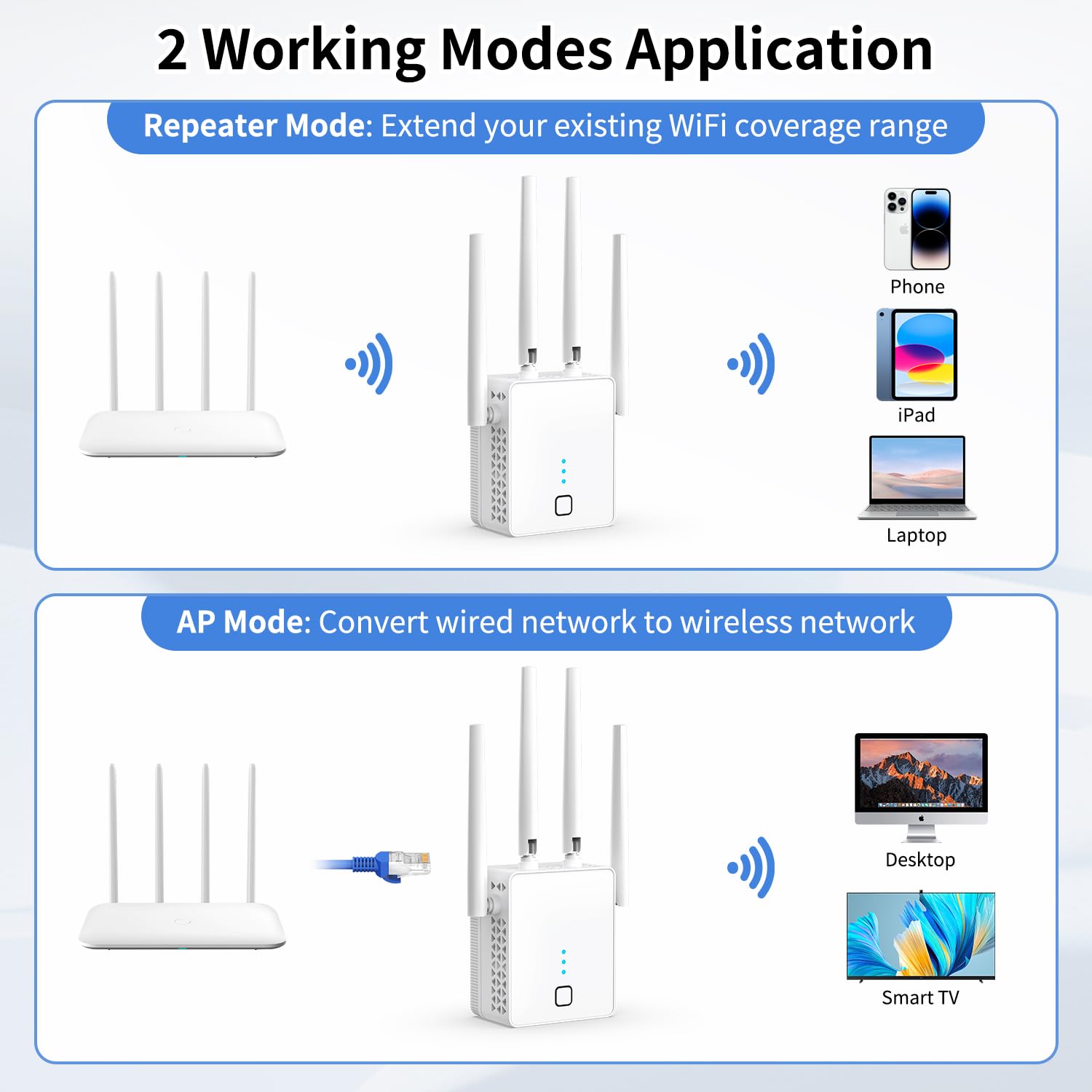 - 【Three Work Modes】Equipped with WiFi repeater, AP mode, and Ethernet port, this device offers versatile functionality to suit various networking needs. Whether extending an existing network, creating a new access point, or connecting wired devices, it provides flexible solutions.
