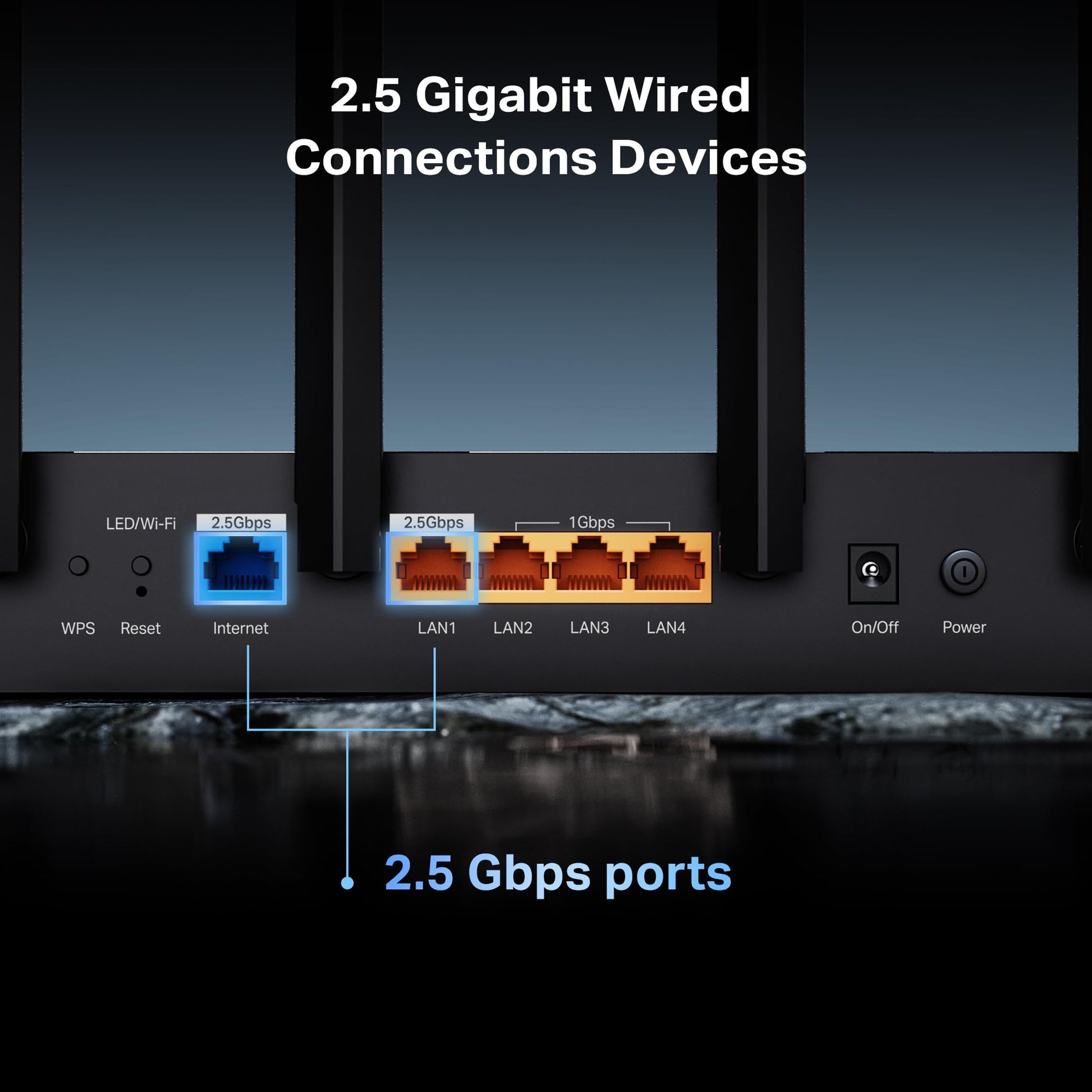 - ๐๐ฅ๐ญ๐ซ๐-๐ ๐๐ฌ๐ญ ๐.๐ ๐๐๐ฉ๐ฌ ๐๐ข๐ซ๐๐ ๐๐๐ซ๐๐จ๐ซ๐ฆ๐๐ง๐๐ - 1x 2.5 Gbps WAN/LAN port, 1x 2.5 Gbps LAN port and 3x 1 Gbps LAN ports offer high-speed data transmissions.ยณ Integrate with a multi-gig modem for gigplus internet.