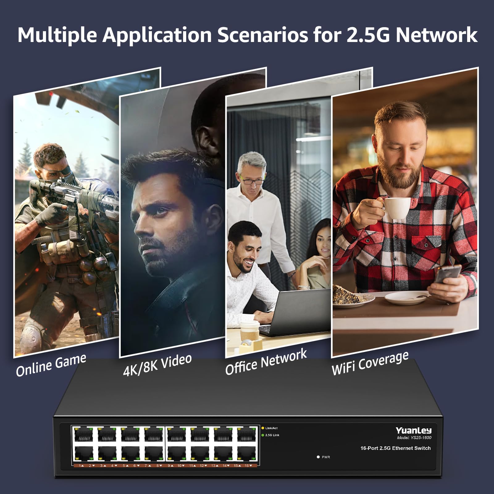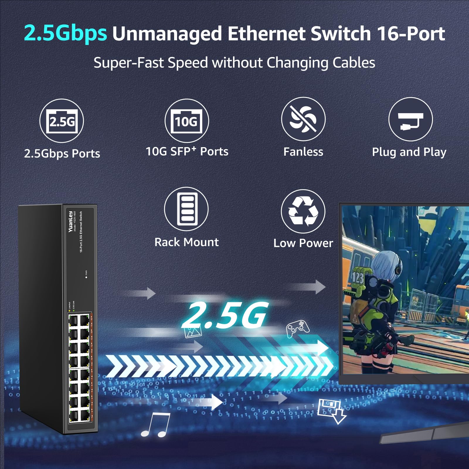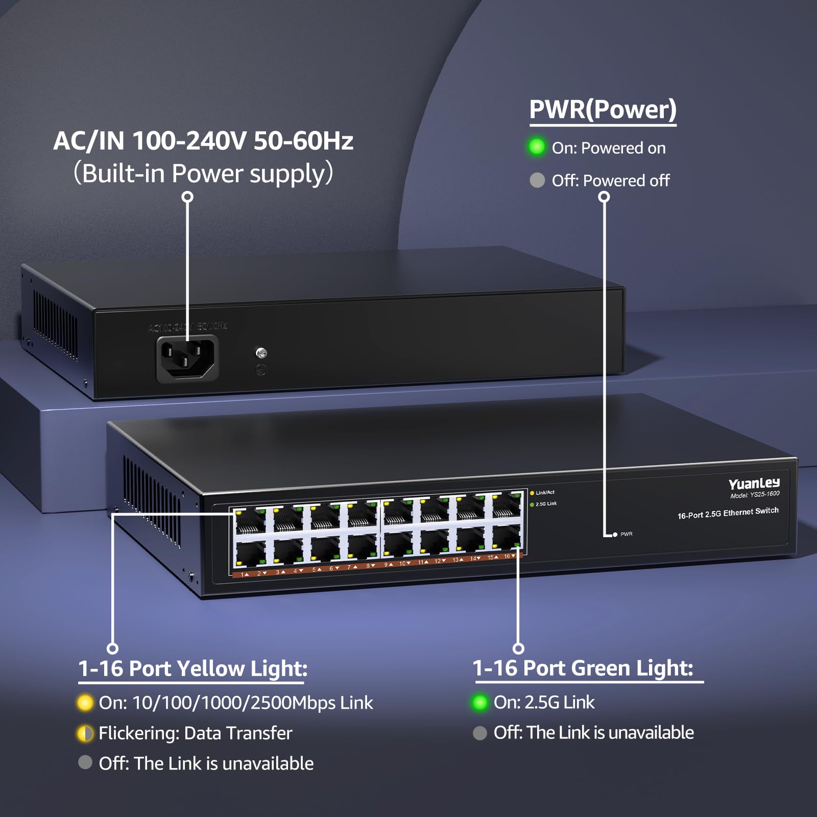 - 【16-Port 2.5G Base-T Ethernet Switch】Equipped with 16 x 2.5G Base-T Ethernet ports, this high-performance 2.5Gbps switch fully supports IEEE802.3bz standard and offers 10/100/1000Mbps/2.5Gbps adaptive speeds with Auto MDI/MDIX, delivering excellent compatibility across your 2.5G network devices.
