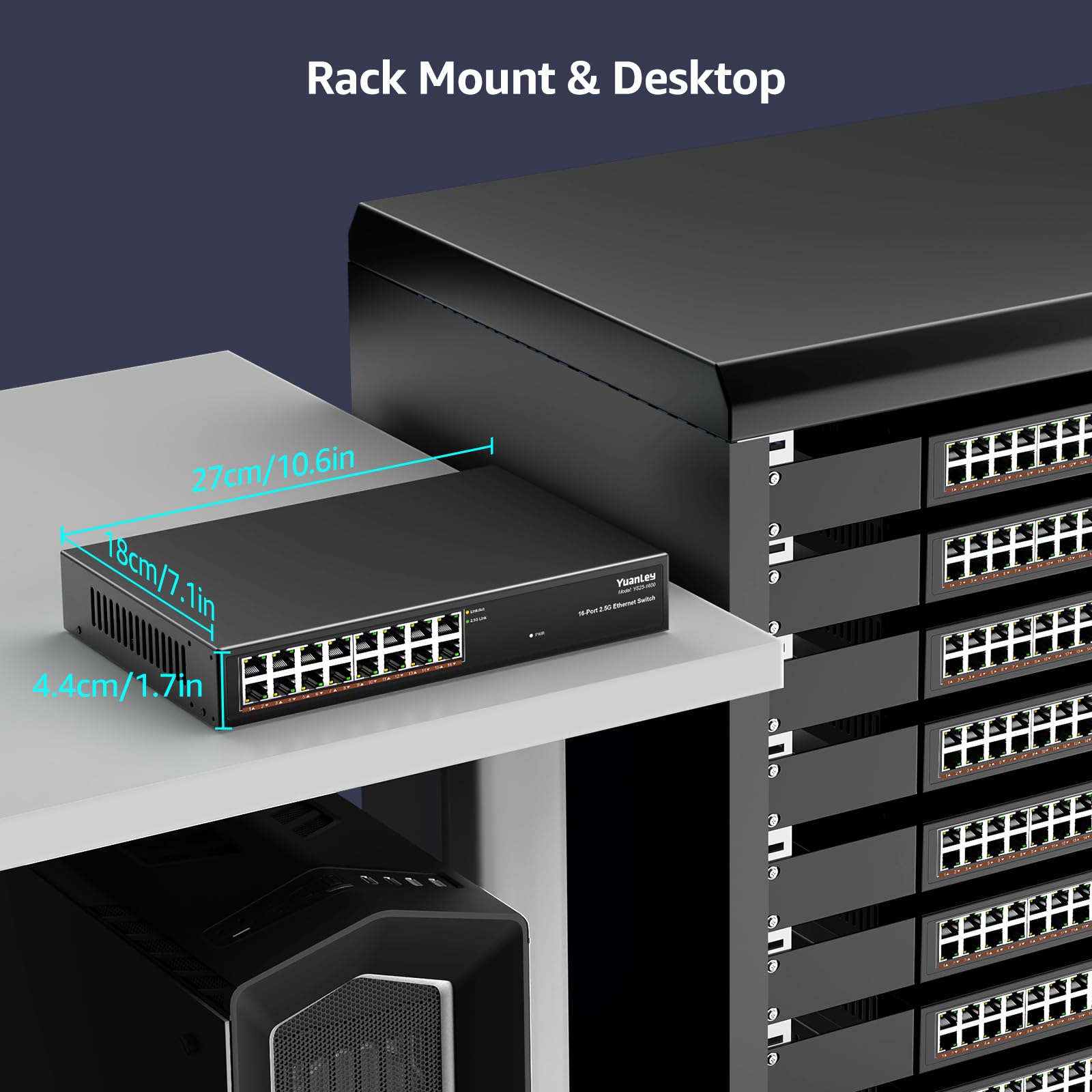 YuanLey 16-Port 2.5Gb Unmanaged Ethernet Switch – 16×2.5G Base-T, Fanless Metal Case, Desktop/Rack Mount